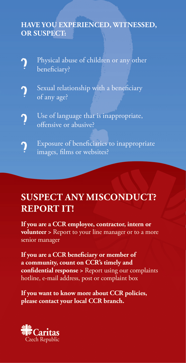 The environment in which we operate is extremely prone to abuse and exploitation as a consequence of power imbalance or violence. Such risks are heightened, in particular, during humanitarian crisis. At Caritas Czech Republic we have rigorous systems in place to make sure that everyone we work with is safe from any harm.